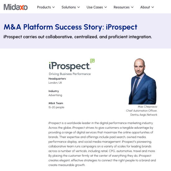 By eliminating inefficient practices and implementing Midaxo’s M&A platform, iProspect quickly enhanced efficiency, accelerating all aspects of post-merger integration work-streams.