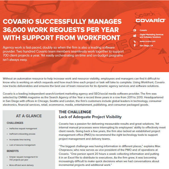 Since rolling out Workfront, Covario (iProspect) has been able to meet some of the aggressive goals—meeting at least 98% of projects on time—it had set when it established its PMO.